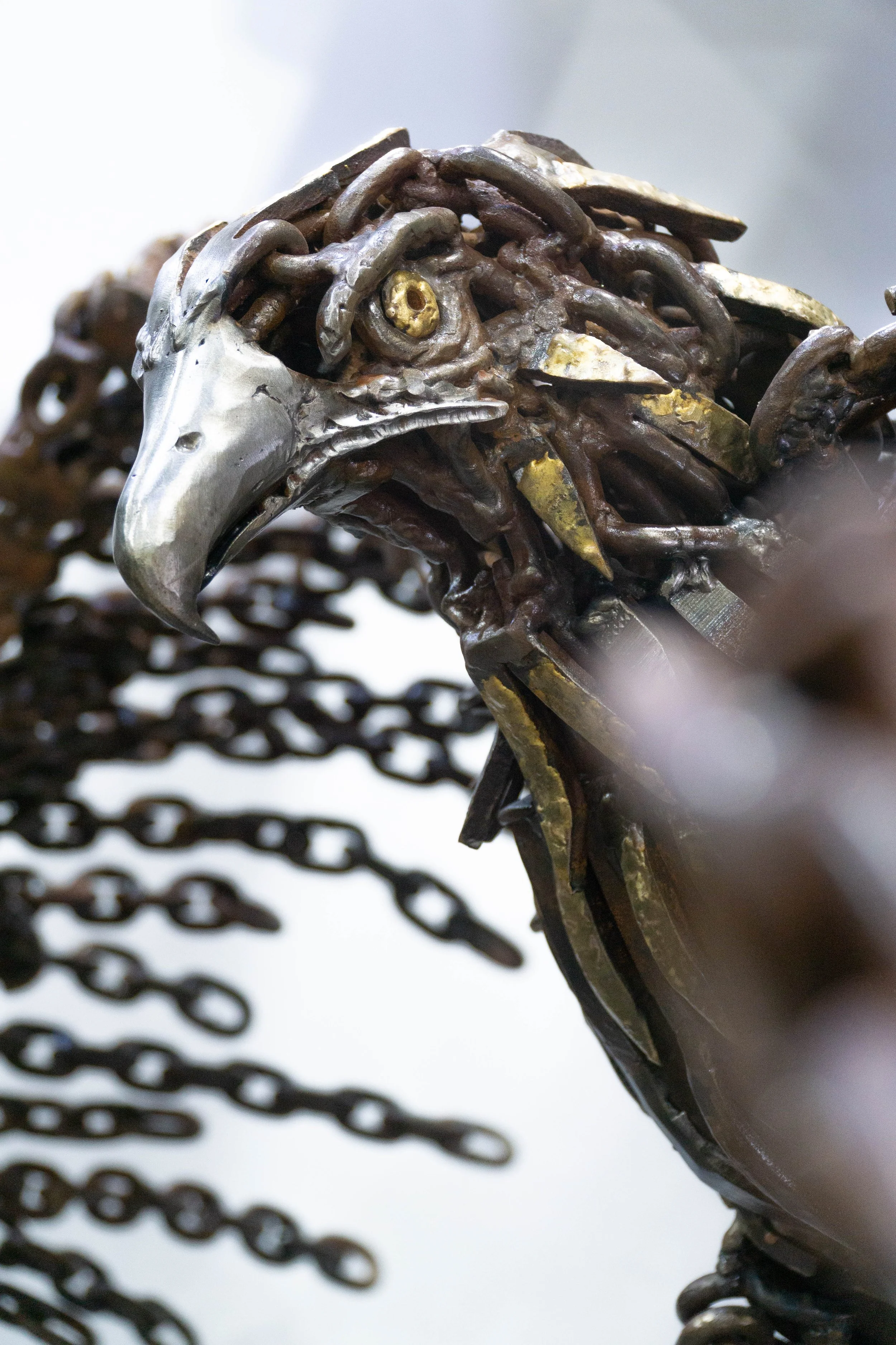 “Unshackled” is a one of a kind sculpture, made entirely of recycled chains and railroad spikes collected from the Pittsburgh community. The eagle has wingspan of 6.5 and is 3.5 feet in depth. Height is dependent on the base desired for installation. “Unshackled” symbolizes perseverance and breaking free from all that holds us down. If you are interested in purchasing this piece, please reach out via email for pricing.
